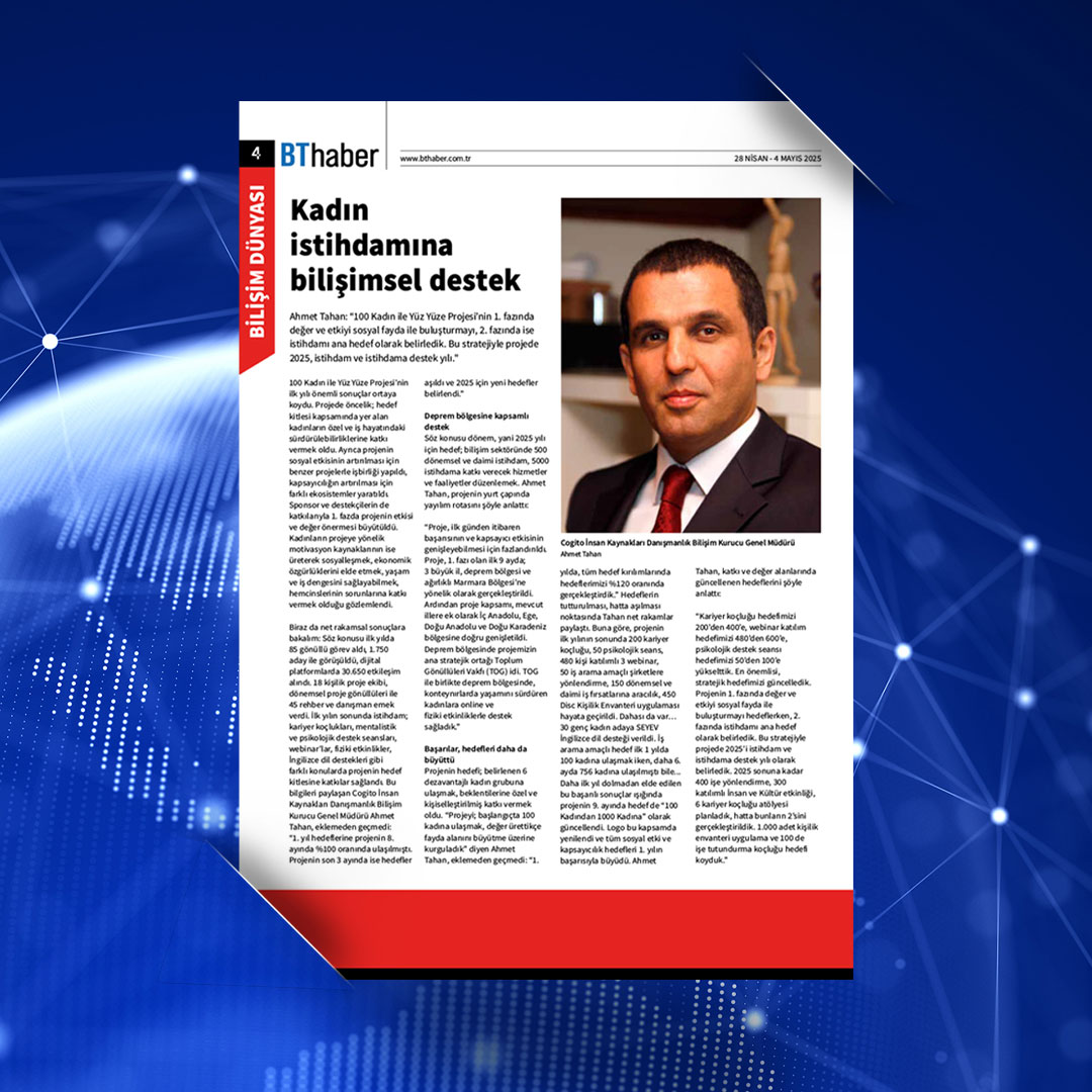“100 Kadın ile Yüz Yüze” projemizde 1 yılı geride bırakıyoruz ve bu konuda projemizin fikir lideri Cogito İK Danışmanlık'ın kurucusu Ahmet Tahan'ın röportajı, BT Haber'de yer aldı. Kadınların iş yaşamında daha etkin olmalarına, iş ve özel hayatlarında sürdürülebilir bir denge kurmalarına destek olmak amacıyla hayata geçirdiğimiz projemizde; kariyer koçluğundan psikolojik desteğe, istihdam amaçlı yönlendirmelerden uygulamalı atölyelere kadar birçok alanda katkı sunuyoruz.